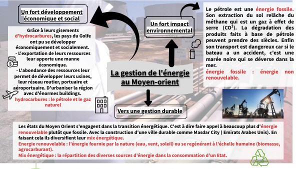 Les états du Moyen Orient s'engagent dans la transition énergétique. C'est à dire faire appel à beaucoup plus d'énergie renouvelable plutôt que fossile. Avec la construction d'une ville durable comme Masdar City ( Emirats Arabes Unis). En faisant cela ils diversifient leur mix énergétique. Energie renouvelable : l’énergie fournie par la nature (eau, vent, soleil) ou se regénérant à l’échelle humaine (biomasse, agrocarburant). Mix énergétique : la répartition des diverses sources d’énergie dans la consommation d’un Etat.
