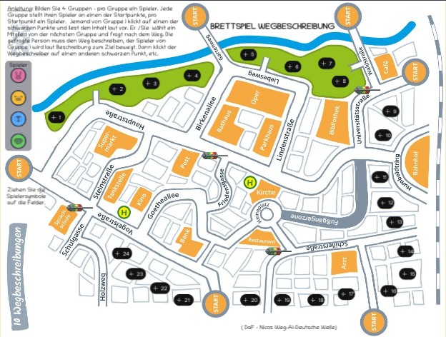 Anleitung: Bilden Sie 4 Gruppen - pro Gruppe ein Spieler. Jede Gruppe stellt ihren Spieler an einen der Startpunkte, pro Startpunkt ein Spieler. Jemand von Gruppe 1 klickt auf einen der schwarzen Punkte und liest den Inhalt laut vor. Er /Sie wählt ein Mitglied von der nächsten Gruppe und fragt nach dem Weg. Die gefragte Person muss den Weg beschreiben, der Spieler von Gruppe 1 wird laut Beschreibung zum Ziel bewegt. Dann klickt der Wegbeschreiber auf einen anderen schwarzen Punkt, etc.