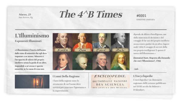 L'illuminismo fu un movimento, intellettuale e politico, che si è svilluppato e diffuso in Europa nel corso del XVII secolo fino all' avvenire della rivoluzione francese, iniziata con la presa della Bastiglia nel 1789. Questo movimento incita l'esssere umano ad utillizzare i così detti lumi della ragione, i quali servono ad illuminare l'ignoranza che è in noi e per liberarci dalle autorità istituzionali quali la chiesa e il potere regio.