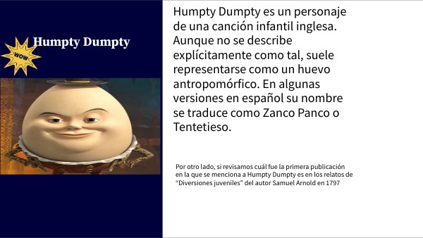 Por otro lado, si revisamos cuál fue la primera publicación en la que se menciona a Humpty Dumpty es en los relatos de “Diversiones juveniles” del autor Samuel Arnold en 1797