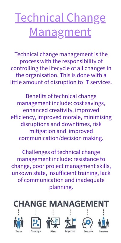 Technical change management is the process with the responsibility of controlling the lifecycle of all changes in the organisation. This is done with a little amount of disruption to IT services. Benefits of technical change management include: cost savings, enhanced creativity, improved efficiency, improved morale, minimising disruptions and downtimes, risk mitigation and improved communication/decision making. Challenges of technical change management include: resistance to change, poor project managment skills, unkown state, insufficient training, lack of communication and inadequate planning.