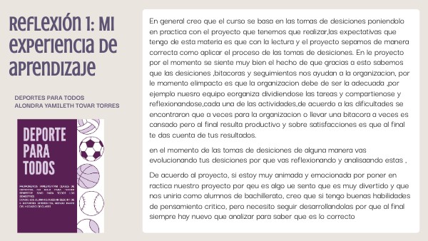 En general creo que el curso se basa en las tomas de desiciones poniendolo en practica con el proyecto que tenemos que realizar,las expectativas que tengo de esta materia es que con la lectura y el proyecto sepamos de manera correcta como aplicar el proceso de las tomas de desiciones. En le proyecto por el momento se siente muy bien el hecho de que gracias a esto sabemos que las desiciones ,bitacoras y seguimientos nos ayudan a la organizacion, por le momento elimpacto es que la organizacion debe de ser la adecuada ,por ejemplo nuesro equipo eorganiza dividiendose las tareas y compartienose y reflexionandose,cada una de las actividades,de acuerdo a las dificultades se encontraron que a veces para la organizacion o llevar una bitacora a veces es cansado pero al final resulta productivo y sobre satisfacciones es que al final te das cuenta de tus resultados. en el momento de las tomas de desiciones de alguna manera vas evolucionando tus desiciones por que vas reflexionando y analisaando estas , De acuerdo al proyecto, si estoy muy animada y emocionada por poner en ractica nuestro proyecto por qeu es algo ue sento que es muy divertido y que nos uniria como alumnos de bachillerato, creo que si tengo buenas habilidades de pensamiento critico, pero necesito seguir desarrollandolas por que al final siempre hay nuevo que analizar para saber que es lo correcto