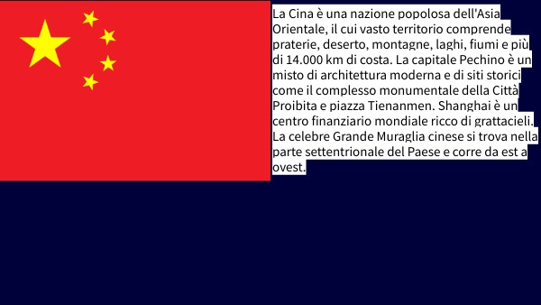 La Cina è una nazione popolosa dell'Asia Orientale, il cui vasto territorio comprende praterie, deserto, montagne, laghi, fiumi e più di 14.000 km di costa. La capitale Pechino è un misto di architettura moderna e di siti storici come il complesso monumentale della Città Proibita e piazza Tienanmen. Shanghai è un centro finanziario mondiale ricco di grattacieli. La celebre Grande Muraglia cinese si trova nella parte settentrionale del Paese e corre da est a ovest.