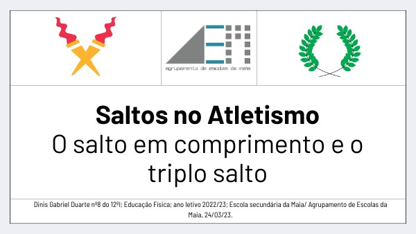 RTP Ensina- https://ensina.rtp.pt/artigo/atletismo-triplo-salto/https://ensina.rtp.pt/artigo/atletismo-salto-em-comprimento/ Comité Olímpico de Portugal-https://comiteolimpicoportugal.pt/ Federação Portuguesa de Atletismo-https://fpatletismo.pt/ Centro de Formação de Associação das Escolas de Matosinhos-https://www.cfaematosinhos.eu/Ozar_23_Saltos_Comp_Tri.pdf Dicas educação física-https://www.dicaseducacaofisica.info/pt-pt/salto-em-comprimento-no-atletismo/ World Athletics-https://www.worldathletics.org/home European Athletics-https://www.european-athletics.com/ Aula Digital Fair Play-https://auladigital.leya.com/pt-PT/resources-player/bundles/6b2ef1ef-fe0e-4175-b663-301a17591e21/views/0eec964e-ce91-422e-8b03-1d42b2d00d59/resources/375acc36-5eb5-44ec-bff7-e04a351c987e?mediatype=application%2Fvnd.openxmlformats-officedocument.presentationml.presentation&resourcename=Atletismo%20-%20Saltos&hi=true&filename=Qx2m3PKMI5.pptx&typology=Apresenta%C3%A7%C3%A3o&origin=ui-publications-library&originarea=pc-bundle-resources&referrer=%2Fpt-PT%2Fproduct_catalogs%2Fbundles%2F6b2ef1ef-fe0e-4175-b663-301a17591e21%2Fresources%3Fproductname%3DFair%2520Play%252010%252F11%252F12%26referrer%3D%252Fpt-PT%252Fproduct_catalogs%252Fbundles%252F
