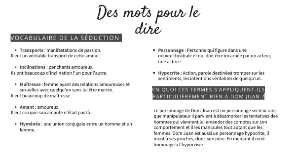 Le personnage de Dom Juan est un personnage secteur ainsi que manipulateur il parvient à désamorcer les tentatives des hommes qui viennent lui emander des comptes sur son comportement et il les manipules tout autant que les femmes. Dom Juan est aussi un personnage hypocrite, il ment à ses proches, donc son père. En mentant il rend hommage a l'hypocrisie.