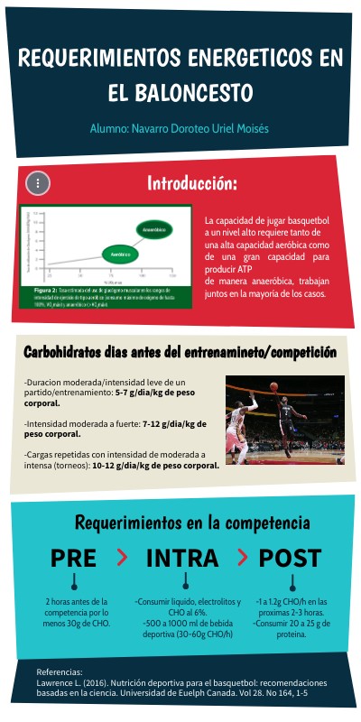 Referencias: Lawrence L. (2016). Nutrición deportiva para el basquetbol: recomendaciones basadas en la ciencia. Universidad de Euelph Canada. Vol 28. No 164, 1-5