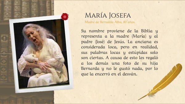 Su nombre proviene de la Biblia y representa a la madre (María) y al padre (José) de Jesús. La anciana es considerada loca, pero en realidad, sus palabras locas y estúpidas solo son ciertas. A causa de esto les regaló a los demás una foto de su hija Bernarda y no le gustó nada, por lo que la encerró en el desván.