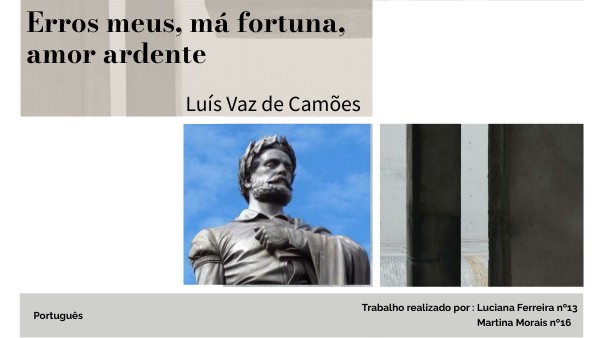 Erros meus, má fortuna, amor ardente Em minha perdição se conjuraram; Os erros e a fortuna sobejaram, Que pera mim bastava amor somente. Tudo passei; mas tenho tão presente A grande dor das cousas que passaram, Que as magoadas iras me ensinaram A não querer já nunca ser contente. Errei todo o discurso de meus anos; Dei causa [a] que a Fortuna castigasse As minhas mal fundadas esperanças. De amor não vi senão breves enganos. Oh! quem tanto pudesse, que fartasse Este meu duro Génio de vinganças!