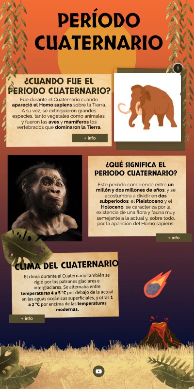 Fue durante el Cuaternario cuando apareció el Homo sapiens sobre la Tierra. A su vez, se extinguieron grandes especies, tanto vegetales como animales, y fueron las aves y mamíferos los vertebrados que dominaron la Tierra.