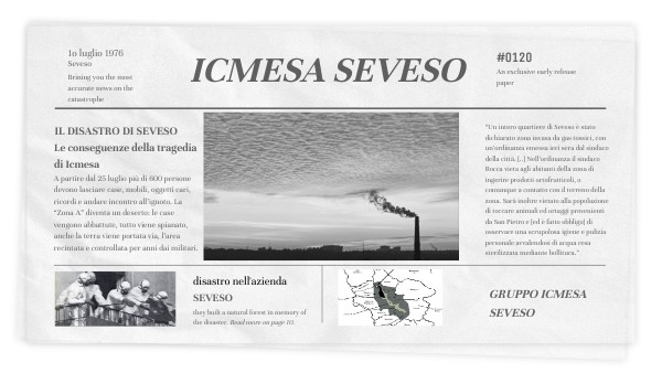 “Un intero quartiere di Seveso è stato dichiarato zona invasa da gas tossici, con un’ordinanza emessa ieri sera dal sindaco della città. [..] Nell’ordinanza il sindaco Rocca vieta agli abitanti della zona di ingerire prodotti ortofrutticoli, o comunque a contatto con il terreno della zona. Sarà inoltre vietato alla popolazione di toccare animali ed ortaggi provenienti da San Pietro e [ed è fatto obbligo] di osservare una scrupolosa igiene e pulizia personale avvalendosi di acqua resa sterilizzata mediante bollitura.”