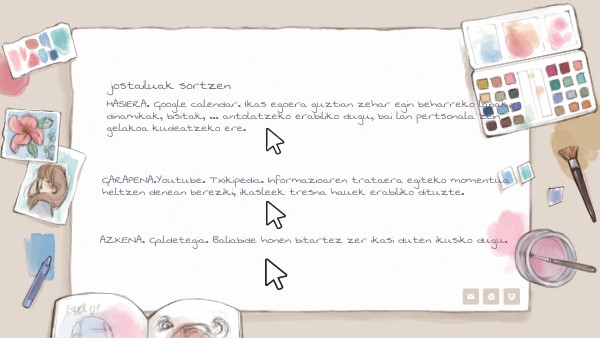 HASIERA. Google calendar. Ikas egoera guztian zehar egin beharreko lanak, dinamikak, bisitak, … antolatzeko erabiliko dugu, bai lan pertsonala zein gelakoa kudeatzeko ere.