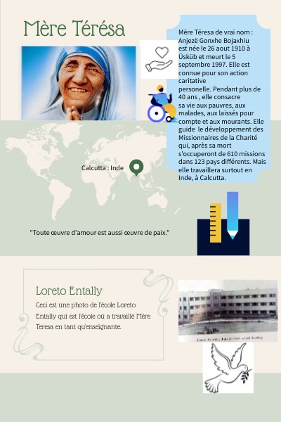 Mère Téresa de vrai nom : Anjezë Gonxhe Bojaxhiu est née le 26 aout 1910 à Üsküb et meurt le 5 septembre 1997. Elle est connue pour son action caritative personelle. Pendant plus de 40 ans , elle consacre sa vie aux pauvres, aux malades, aux laissés pour compte et aux mourants. Elle guide le développement des Missionnaires de la Charité qui, après sa mort s'occuperont de 610 missions dans 123 pays différents. Mais elle travaillera surtout en Inde, à Calcutta.