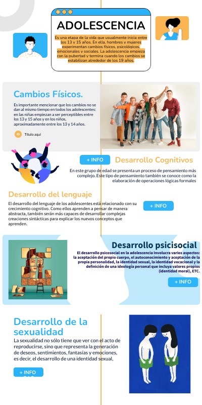 Es una etapa de la vida que usualmente inicia entre los 13 y 15 años. En ella, hombres y mujeres experimentan cambios físicos, psicológicos, emocionales y sociales. La adolescencia empieza con la pubertad y termina cuando los cambios se estabilizan alrededor de los 19 años.