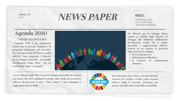 L'Agenda 2030 è un programma d'azione per le persone, il pianeta e la prosperità, sottoscritto nel settembre 2015 dai governi dei 193 Paesi membri dell'ONU. Essa comprende 17 obiettivi per lo sviluppo sostenibile - Sustainable Developement Goals, SDGs - per un totale di 169 "target" o traguardi.