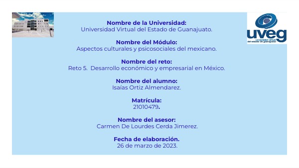 Nombre de la Universidad:Universidad Virtual del Estado de Guanajuato. Nombre del Módulo:Aspectos culturales y psicosociales del mexicano. Nombre del reto:Reto 5. Desarrollo económico y empresarial en México. Nombre del alumno: Isaías Ortiz Almendarez. Matrícula: 21010479. Nombre del asesor: Carmen De Lourdes Cerda Jimerez. Fecha de elaboración. 26 de marzo de 2023.