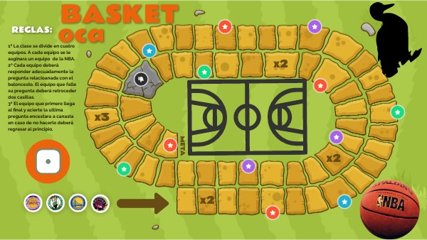 1º La clase se divide en cuatro equipos. A cada equipo se le asginara un equipo de la NBA.2º Cada equipo deberá responder adecuadamente la pregunta relacioanada con el baloncesto. El equipo que falle su pregunta deberá retroceder dos casillas. 3º El equipo que primero llega al final y acierte la ultima pregunta encestara a canasta en caso de no hacerlo deberá regresar al principio.
