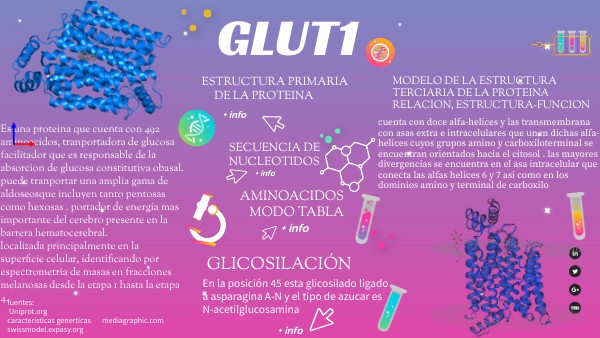 Es una proteina que cuenta con 492 aminoacidos, tranportadora de glucosa facilitador que es responsable de la absorcion de glucosa constitutiva obasal. puede tranportar una amplia gama de aldoseosque incluyen tanto pentosas como hexosas . portador de energia mas importante del cerebro presente en la barrera hematocerebral.localizada principalmente en la superficie celular, identificando por espectrometria de masas en fracciones melanosas desde la etapa 1 hasta la etapa 4.