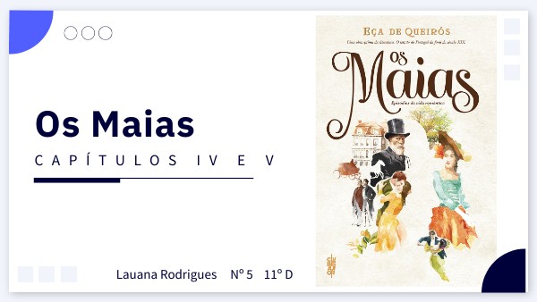 Neste trabalho irei apresentar um resumo sobre os capítulos IV e V do livro Os Maias do autor Eça de Queirós. A seguir quais os personagens estão presentes nestes capítulos,além de seu espaço e tempo ocorrido,assim como, elementos ou críticas que estão presentes e por último e não menos importante a linguagem e estilo dois capítulos.