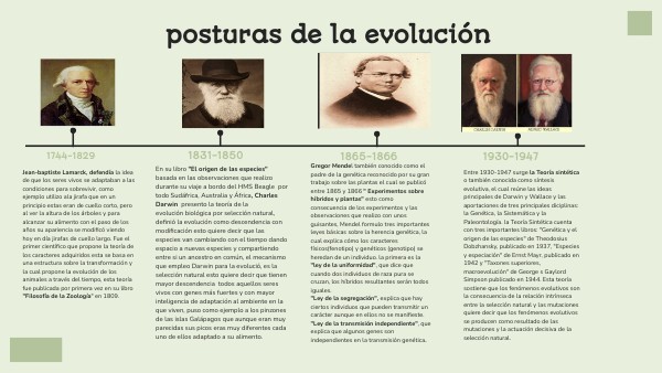 Jean-baptiste Lamarck, defendía la idea de que los seres vivos se adaptaban a las condiciones para sobrevivir, como ejemplo utilizo ala jirafa que en un principio estas eran de cuello corto, pero al ver la altura de los árboles y para alcanzar su alimento con el paso de los años su apariencia se modificó viendo hoy en día jirafas de cuello largo. Fue el primer científico que propone la teoría de los caracteres adquiridos esta se basa en una estructura sobre la transformación y la cual propone la evolución de los animales a través del tiempo, esta teoría fue publicada por primera vez en su libro "Filosofía de la Zoología" en 1809.