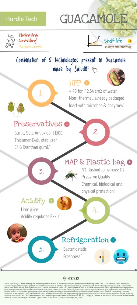 1. Sinha, D. (2020, July 24). Hurdle Technology. PMG Engineering. Retrieved March 21, 2023, from https://www.pmg.engineering/hurdle-technology/ (Sinha, 2020) 2. Salud Foodgroup Europe. HPP Natural guacamole 500g. Salud Foodgroup Europe. (2022, December 6). Retrieved March 21, 2023, from https://www.saludfoodgroup.eu/products/avocado/211-100-natural-guacamole (Salud, 2022) 3. Government of Canada. Foods treated with high pressure processing (HPP) - Canadian Food Inspection Agency. (2023, March 10) Retrieved March 21, 2023, from https://inspection.canada.ca/preventive-controls/high-pressure-processing/eng/1498504011314/1498504256677 (Government of Canada, 2023) 4. Gibbons, K. Guacamole: technology makes way for explosion in processed products. (2016, September 16). Produce Processing. Retrieved March 21, 2023, from https://produceprocessing.net/article/guacamole-technology-makes-way-for-explosion-in-processed-products/ (Gibbons, 2016) 5.Hiperbaric. Avocado & Guacamole Preservation by HPP. Hiperbaric. (2023). Retrieved March 21, 2023, from https://www.hiperbaric.com/en/hpp-technology/hpp-applications/guacamole-and-avocado-products/ (Hiperbaric, 2023) G6.uacamo dely. Production Plant. Guacamo dely. (2020). Retrieved March 21, 2023, from http://guacamodely.com/en/facilities (Guacamo dely, 2020) 7. Vargas, M., Contreras, M. and Castro, E. (2020 November). Avocado-Derived Biomass as a Source of Bioenergy and Bioproducts. Applied Sciences. 10. 8195. DOI: 10.3390/app10228195. (Vargas et al, 2020)