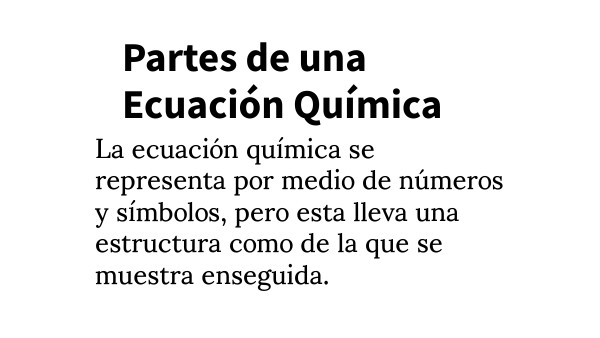 La ecuación química se representa por medio de números y símbolos, pero esta lleva una estructura como de la que se muestra enseguida.