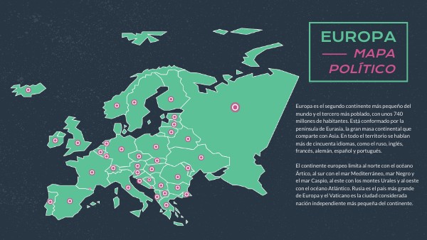 Europa es el segundo continente más pequeño del mundo y el tercero más poblado, con unos 740 millones de habitantes. Está conformado por la península de Eurasia, la gran masa continental que comparte con Asia. En todo el territorio se hablan más de cincuenta idiomas, como el ruso, inglés, francés, alemán, español y portugués. El continente europeo limita al norte con el océano Ártico, al sur con el mar Mediterráneo, mar Negro y el mar Caspio, al este con los montes Urales y al oeste con el océano Atlántico. Rusia es el país más grande de Europa y el Vaticano es la ciudad considerada nación independiente más pequeña del continente.