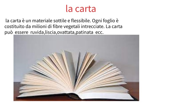 la carta è un materiale sottile e flessibile:ogni foglio è costituito da ogni milioni di fibre vegetali intrecciate le sue proprietà dipendono dai trattamenti a cui viene sottoposta la superficie: la carta può essere liscia ,ruvida,ovattata,patinata ecc.
