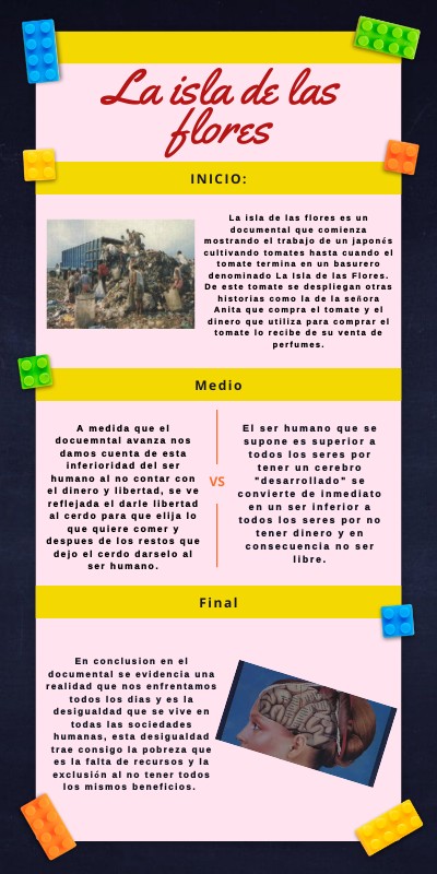 La isla de las flores es un documental que comienza mostrando el trabajo de un japonés cultivando tomates hasta cuando el tomate termina en un basurero denominado La Isla de las Flores. De este tomate se despliegan otras historias como la de la señora Anita que compra el tomate y el dinero que utiliza para comprar el tomate lo recibe de su venta de perfumes.