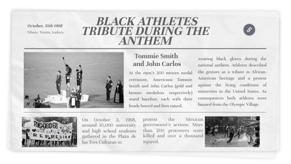 wearing black gloves during the national anthem. Athletes described the gesture as a tribute to African-American heritage and a protest against the living conditions of minorities in the United States. As consequences both athletes were banned from the Olympic Village