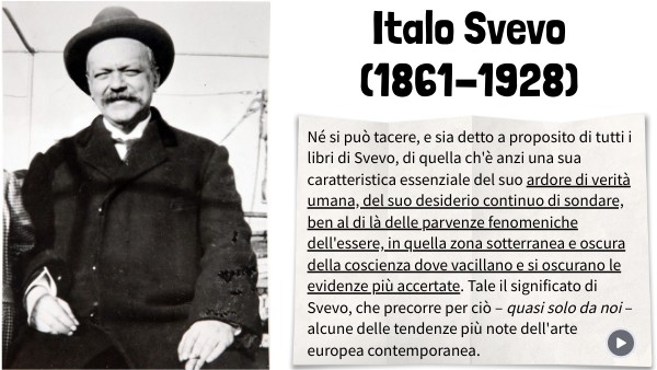Nasce nel 1861 a Trieste, allora Impero Asburgico Ha una formazione letteraria mitteleuropea (Vienna è il centro propulsore della cultura mitteleuropea del 900) e non italiana e, soprattutto, ha una formazione tecnica: prima impiegato in banca e poi dirigente d'industria del suocero. Italo Svevo è uno pseudonimo nato per comunicare la doppia identità dell'autore: italiano e austriaco. In Italia non viene compreso e i suoi romanzi non hanno successo (solo Montale lo comprende), mentre sul panorama internazionale acquisisce fama grazie alla critica dell'amico James Joyce.