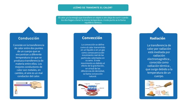 Consiste en la transferencia de calor entre dos puntos de un cuerpo que se encuentran a diferente temperatura sin que se produzca transferencia de materia entre ellos. Los mejores conductores de calor son metales, en cambio, el aire es un mal conductor del calor.