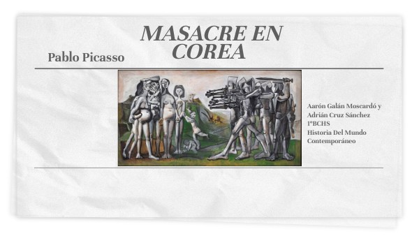 Podemos ver que Picasso representa la obra de manera que hay dos bandos: a la derecha un grupo de mujeres y niños , y a la izquierda un grupo de soldados.