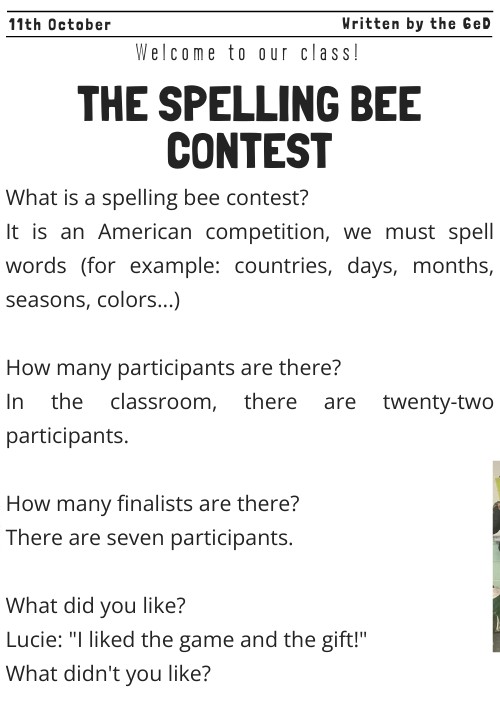 What is a spelling bee contest?It is an American competition, we must spell words (for example: countries, days, months, seasons, colors...)How many participants are there?In the classroom, there are twenty-two participants.How many finalists are there? There are seven participants.What did you like?Lucie: "I liked the game and the gift!"What didn't you like?