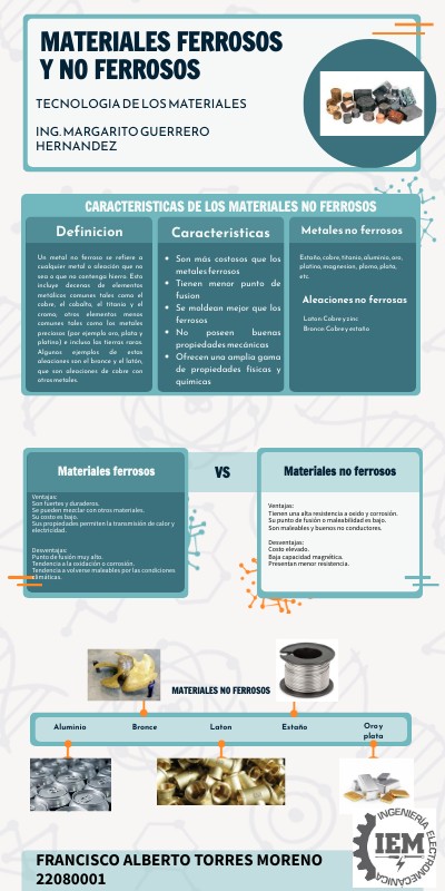 Un metal no ferroso se refiere a cualquier metal o aleación que no sea o que no contenga hierro. Esto incluye decenas de elementos metálicos comunes tales como el cobre, el cobalto, el titanio y el cromo; otros elementos menos comunes tales como los metales preciosos (por ejemplo oro, plata y platino) e incluso las tierras raras. Algunos ejemplos de estas aleaciones son el bronce y el latón, que son aleaciones de cobre con otros metales.