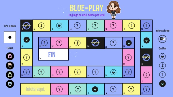 ¿Quién es tu personaje principal? Soy yo el personaje principal en forma animada ¿Cuál es su nombre? azul alva lara ¿Cómo lo describes? Ella tienen una playera negra, jean y cabello corto chino, es inteligente, creativa y le gusta estar rodeada de las personas que quiere, le gustan los perros, tiene un hermano y le gusta explorar. , ¿qué lugar?, ¿ qué época?, ¿cuál es la forma del tablero? v ¿Qué es lo que anhela alcanzar? el juego es un tablero principalmente morado con multiples colores, el objetivo del juego es que sepas un poco m'as sobre la vida de Azul y que puedas aprender datos curiosos. forma de ganar, ¿qué buscas? ¿Cuál es el objetivo? para poder ganar tienes que ir contestando todas las preguntas de la trivia de manera correcta, para poder avanzar casillas y asi ganar para llegar a la casilla "fin" v ¿Cuál es el problema o problemas a los que se enfrenta? ¿Por qué esta situación es un reto? v ¿Cuáles son los recursos con los que cuenta para hacerle frente a los obstáculos?.- Estos son recursos físicos, emocionales, humanos (personas aliadas que lo apoyan), o de conocimientos. v ¿Quiénes son los villanos?.- el que se opone a que consigas lo que quieres o las cosas o pensamientos que no te permiten avanzar en la dirección correcta.