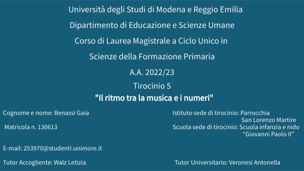 Cognome e nome: Benassi Gaia Istituto sede di tirocinio: Parrocchia San Lorenzo Martire Matricola n. 130613 Scuola sede di tirocinio: Scuola infanzia e nido “Giovanni Paolo II” E-mail: 253970@studenti.unimore.it Tutor Accogliente: Walz Letizia Tutor Universitario: Veronesi Antonella
