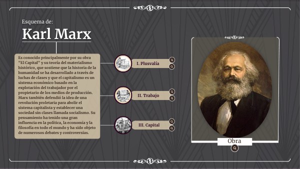Es conocido principalmente por su obra "El Capital" y su teoría del materialismo histórico, que sostiene que la historia de la humanidad se ha desarrollado a través de luchas de clases y que el capitalismo es un sistema económico basado en la explotación del trabajador por el propietario de los medios de producción. Marx también defendió la idea de una revolución proletaria para abolir el sistema capitalista y establecer una sociedad sin clases llamada socialismo. Su pensamiento ha tenido una gran influencia en la política, la economía y la filosofía en todo el mundo y ha sido objeto de numerosos debates y controversias.