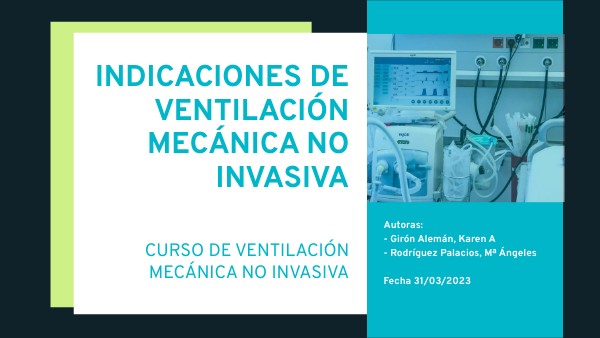 -Rialp Cervera G, del Castillo Blanco A, Pérez Aizcorreta O, Parra Morais L. Ventilación mecánica no invasiva en la enfermedad pulmonar obstructiva crónica y en el edema agudo de pulmón cardiogénico. Med Intensiva. 2014; 38:111–21. Disponible en: https://www.medintensiva.org/es-ventilacion-mecanica-no-invasiva-enfermedad-articulo-S0210569112003038 - Muñoz Bono J, Curiel Balsera E, Galeas López JL. Indicaciones en ventilación mecánica no invasiva. ¿Evidencias en la bibliografía médica? Med Clin (Barc). Elservier. 2011. 136(3):116–20. Disponible en: https://www.elsevier.es/es-revista-medicina-clinica-2-articulo-indicaciones-ventilacion-mecanica-no-invasiva--S0025775309015577?code=XHBhJervU0OWimGnoEPq7FfpMLTsQD&newsletter=true- Domingo D, Martínez A. Guía para la utilización de la ventilación mecánica no invasiva en Urgencias. Actualización 2016. Hospital de Sagunto. 2016. Disponible en: https://sagunto.san.gva.es/documents/7967159/7992985/Gu%C3%ADa+para+la+utilizaci%C3%B3n+de+la+VMNI+en+URG.pdf- UGC Medicina Interna Hospital Universitario Reina Sofia. Unidad de ventilación mecánica no invasiva. 2017. Disponible en: https://www.sspa.juntadeandalucia.es/servicioandaluzdesalud/hrs3/fileadmin/user_upload/area_medica/medicina_interna/unidad_ventilacion_mecanica_no_invasiva.pdf- del Castillo Otero D, Cabrera Galán C, Arenas Gordillo M, Valenzuela Mateos F. Capítulo 14. Ventilación mecánica no invasiva. Neumosur. Disponible en: https://www.neumosur.net/files/ebooks/EB04-13_VMNI.pdf- del Castillo Otero D, Cortés Caballero A, García Cuesta A, de la Cruz Castro NP. Ventilación mecánica no invasiva (VNI) en pacientes agudos y crónicos. Neumosur. Disponible en: https://www.neumosur.net/files/publicaciones/ebook/14-VNI-Neumologia-3_ed.pdf- Redondo J, Gómez ML, Madrazo M et al. Manual de Ventilación Mecánica no Invasiva. Manual de VMNI del HGUCR. Ciudad Real. Disponible en: https://www.semes.org/wp-content/uploads/2019/05/Manual-VMNI-del-HUGCR.pdf- Ventilación mecánica no invasiva - Manuales Clínicos. Manuales Clínicos. HUVR. 2020. Disponible en: https://manualclinico.hospitaluvrocio.es/urgencias/neumologia/ventilacion-mecanica-no-invasiva/ - Luján M, Peñuelas O, Cinesi C et al. Recomendaciones sobre la utilización de la ventilación no invasiva y terapia de alto flujo con cánulas nasales en el paciente adulto, pediátrico y neonatal con insuficiencia respiratoria aguda grave. Documento de Consenso de las Sociedades Científicas Españolas (SEPAR, SEMICYUC, SEMES; SECIP, SENeo, SEDAR, SENP). 2020. Disponible en: https://semicyuc.org/wp-content/uploads/2020/10/Recomendaciones-Consenso-VMNI.pdf