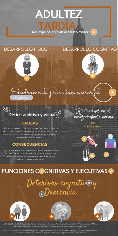 UVEG (2023). Lección 7: Desarrollo físico e intelectual en la edad adulta tardía. Recuperado el 24 de marzo de 2023 de UVEG, sitio web: Curso: Procesos del desarrollo en el adulto y adulto mayor v1 (uveg.edu.mx) UVEG (2023). Lección 8: Neuropsicología de la vejez. Recuperado el 24 de marzo de 2023 de UVEG, sitio web: Procesos del desarrollo en el adulto y adulto mayor v1: L8. Neuropsicología de la vejez (uveg.edu.mx)