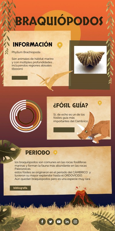 los braquiópodos son comunes en las rocas fosilíferas marinas y forman la fauna más abundante en las rocas Paleozoicas. estos fósiles se originaron en el periodo del CÁMBRICO y tuvieron su mayor explendor hasta el ORDOVÍCIDO. Aún quedan braquiópodos pero es una especie muy rara