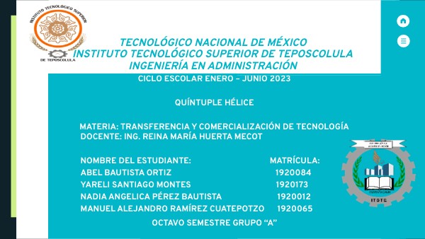 QUÍNTUPLE HÉLICE MATERIA: TRANSFERENCIA Y COMERCIALIZACIÓN DE TECNOLOGÍA OCTAVO SEMESTRE GRUPO “A” San Pedro y San Pablo Teposcolula a 15 de marzo de 2023
