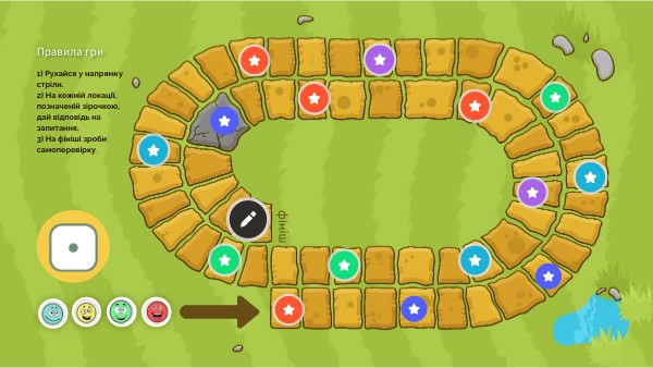 1) Рухайся у напрямку стріли.2) На кожній локації, позначеній зірочкою, дай відповідь на запитання. 3) На фініші зроби самоперевірку.