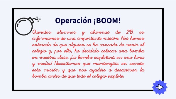 Queridos alumnos y alumnas de 2ºB, os informamos de una importante misión. Nos hemos enterado de que alguien se ha cansado de venir al colegio y, por ello, ha decidido colocar una bomba en vuestra clase. ¡La bomba explotará en una hora y media! Necesitamos que mantengáis en secreto esta misión y que nos ayudéis a desactivar la bomba antes de que todo el colegio explote.