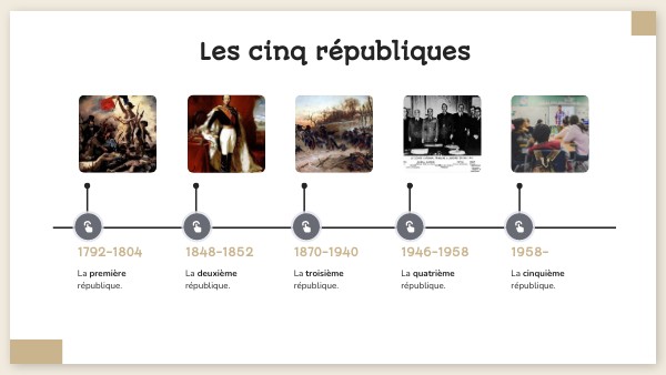 Le 4 octobre 1958 Charles de Gaulle proclame la Vème rèpublique. Les présidents depuis 1958 sont:
