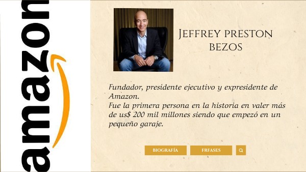 Fundador, presidente ejecutivo y expresidente de Amazon.Fue la primera persona en la historia en valer más de us$ 200 mil millones siendo que empezó en un pequeño garaje.