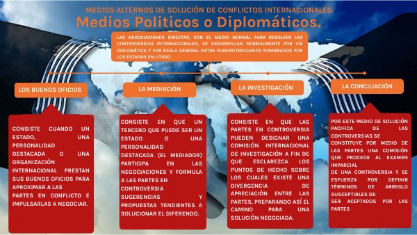 Los medios jurídicos de solución pacífica de las controversias internacionales son el arbitraje y la solución judicial (justicia internacional), ambos terminan con la decisión obligatoria de un Tribunal