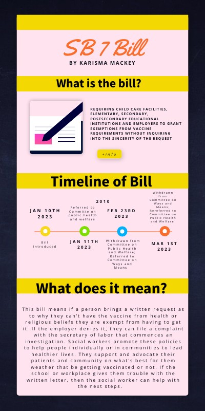 This bill means if a person brings a written request as to why they can't have the vaccine from health or religious beliefs they are exempt from having to get it. If the employer denies it, they can file a complaint with the secretary of labor that commences an investigation. Social workers promote these policies to help people individually or in communities to lead healthier lives. They support and advocate their patients and community on what's best for them weather that be getting vaccinated or not. If the school or workplace gives them trouble with the written letter, then the social worker can help with the next steps.
