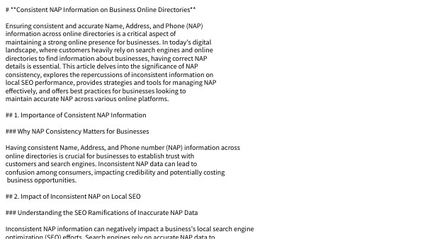 # **Consistent NAP Information on Business Online Directories**Ensuring consistent and accurate Name, Address, and Phone (NAP) information across online directories is a critical aspect of maintaining a strong online presence for businesses. In today's digital landscape, where customers heavily rely on search engines and online directories to find information about businesses, having correct NAP details is essential. This article delves into the significance of NAP consistency, explores the repercussions of inconsistent information on local SEO performance, provides strategies and tools for managing NAP effectively, and offers best practices for businesses looking to maintain accurate NAP across various online platforms.## 1. Importance of Consistent NAP Information### Why NAP Consistency Matters for BusinessesHaving consistent Name, Address, and Phone number (NAP) information across online directories is crucial for businesses to establish trust with customers and search engines. Inconsistent NAP data can lead to confusion among consumers, impacting credibility and potentially costing business opportunities.## 2. Impact of Inconsistent NAP on Local SEO### Understanding the SEO Ramifications of Inaccurate NAP DataInconsistent NAP information can negatively impact a business's local search engine optimization (SEO) efforts. Search engines rely on accurate NAP data to determine a business's legitimacy and relevance to local searches. Discrepancies in NAP can confuse search engines, leading to lower search rankings and decreased online visibility.## 3. Strategies for Maintaining Consistent NAP Across Directories### Utilizing Data Aggregators for NAP Distribution### Implementing a Centralized NAP Management SystemTo ensure consistent NAP information across online directories, businesses can leverage data aggregators to distribute accurate information to various platforms. Additionally, implementing a centralized NAP management system allows businesses to update and monitor their information efficiently, minimizing the risk of discrepancies.## 4. Tools for Managing NAP Information Effectively### Top NAP Management Tools for BusinessesBusinesses can utilize NAP management tools such as Bleu7, Moz Local, and BrightLocal to streamline the process of maintaining consistent NAP information across online directories. These tools offer functionalities like automated updates, monitoring, and reporting to help businesses effectively manage their NAP data and improve their online presence.## 5. Best Practices for Updating NAP on Online Directories### Regular Auditing and Updating of NAP Listings[Keeping your business information up-to-date across online directories](https://www.bleu7.com) is like watering a plant – neglect it, and it might wither away. Regularly audit your NAP listings to ensure accuracy and consistency. Set a calendar reminder or use automated tools to simplify this task.### Guidelines for Standardizing NAP FormatConsistency is key when it comes to NAP information. Establish clear guidelines for how your business name, address, and phone number should appear across all directories. This prevents confusion among customers and search engines, [enhancing your online presence](https://stellarsphinx.com/).## 6. Case Studies: Success Stories with Consistent NAPCurious to see the magic of consistent NAP in action? Dive into these case studies showcasing businesses that nailed their NAP game. From increased visibility to boosted customer trust, these success stories highlight the real-world benefits of maintaining accurate NAP across online directories.## 7. Common Challenges in Ensuring NAP ConsistencyAh, the plot thickens. Despite the importance of uniform NAP data, businesses often face hurdles in maintaining consistency. From outdated listings to human error, navigating the world of online directories can be a bit of a maze. Uncover these common challenges and learn how to overcome them for seamless NAP management.## 8. Future Trends in NAP Management for BusinessesAs technology evolves, so does the landscape of NAP management. What does the future hold for businesses looking to master their online presence? Explore emerging trends in NAP management, from AI-driven solutions to voice search optimization. Stay ahead of the curve and ensure your NAP remains a beacon of accuracy in the digital world.In conclusion, maintaining consistent NAP information on online directories is not just a best practice but a fundamental requirement for businesses looking to enhance their online visibility and credibility. By understanding the importance of NAP consistency, implementing effective strategies, and staying ahead of future trends in NAP management, businesses can strengthen their local SEO efforts and provide customers with reliable and accurate information. Embracing NAP consistency as a core element of digital marketing will undoubtedly contribute to long-term success in today's competitive online landscape.