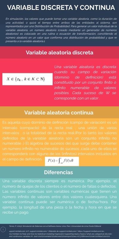 Torres, P., (2013). Simulación de Sistemas con el Software Arena, Lima, Perú: Universidad de Lima Fondo Editorial.upport.minitab.com. (s.f.). support.minitab.com/. Obtenido de support.minitab.com/: https://support.minitab.com/es-mx/minitab/21/help-and-how-to/statistical-modeling/regression/supporting-topics/basics/what-are-categorical-discrete-and-continuous-variables/#:~:text=Una%20variable%20discreta%20siempre%20es,n%C3%BAmero%20de%20fallas%20o%20