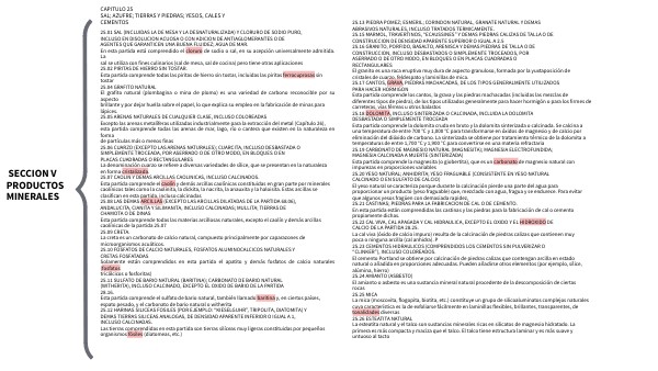 25.13 PIEDRA POMEZ; ESMERIL; CORINDON NATURAL, GRANATE NATURAL Y DEMAS ABRASIVOS NATURALES, INCLUSO TRATADOS TERMICAMENTE. 25.15 MARMOL, TRAVERTINOS, “ECAUSSINES” Y DEMAS PIEDRAS CALIZAS DE TALLA O DE CONSTRUCCION DE DENSIDAD APARENTE SUPERIOR O IGUAL A 2.5 25.16 GRANITO, PORFIDO, BASALTO, ARENISCA Y DEMAS PIEDRAS DE TALLA O DE CONSTRUCCION, INCLUSO DESBASTADOS O SIMPLEMENTE TROCEADOS, POR ASERRADO O DE OTRO MODO, EN BLOQUES O EN PLACAS CUADRADAS O RECTANGULARES El granito es una roca eruptiva muy dura de aspecto granuloso, formada por la yuxtaposición de cristales de cuarzo, feldespato y laminillas de mica. 25.17 CANTOS, GRAVA, PIEDRAS MACHACADAS, DE LOS TIPOS GENERALMENTE UTILIZADOS PARA HACER HORMIGON Esta partida comprende los cantos, la grava y las piedras machacadas (incluidas las mezclas de diferentes tipos de piedra), de los tipos utilizados generalmente para hacer hormigón o para los firmes de carreteras, vías férreas u otros balastos 25.18 DOLOMITA, INCLUSO SINTERIZADA O CALCINADA, INCLUIDA LA DOLOMITA DESBASTADA O SIMPLEMENTE TROCEADA Esta partida comprende la dolomita cruda en bruto y la dolomita sinterizada o calcinada. Se calcina a una temperatura de entre 700 °C y 1,000 °C para transformarse en óxidos de magnesio y de calcio por eliminación del dióxido de carbono. La sinterizada se obtiene por tratamiento térmico de la dolomita a temperaturas de entre 1,700 °C y 1,900 °C para convertirse en una materia refractaria 25.19 CARBONATO DE MAGNESIO NATURAL (MAGNESITA); MAGNESIA ELECTROFUNDIDA; MAGNESIA CALCINADA A MUERTE (SINTERIZADA) Esta partida comprende la magnesita (o giobertita), que es un carbonato de magnesio natural con impurezas en proporciones variables 25.20 YESO NATURAL; ANHIDRITA; YESO FRAGUABLE (CONSISTENTE EN YESO NATURAL CALCINADO O EN SULFATO DE CALCIO) El yeso natural se caracteriza porque durante la calcinación pierde una parte del agua para proporcionar un producto (yeso fraguable) que, mezclado con agua, fragua y se endurece. Para evitar que algunos yesos fragüen con demasiada rapidez, 25.21 CASTINAS; PIEDRAS PARA LA FABRICACION DE CAL O DE CEMENTO. En esta partida están comprendidas las castinas y las piedras para la fabricación de cal o cemento propiamente dichas. 25.22 CAL VIVA, CAL APAGADA Y CAL HIDRAULICA, EXCEPTO EL OXIDO Y EL HIDROXIDO DE CALCIO DE LA PARTIDA 28.25. La cal viva (óxido de calcio impuro) resulta de la calcinación de piedras calizas que contienen muy poca o ninguna arcilla (cal anhidra). P 25.23 CEMENTOS HIDRAULICOS (COMPRENDIDOS LOS CEMENTOS SIN PULVERIZAR O “CLINKER”), INCLUSO COLOREADOS. El cemento Portland se obtiene por calcinación de piedras calizas que contengan arcilla en estado natural o añadida en proporciones adecuadas. Pueden añadirse otros elementos (por ejemplo, sílice, alúmina, hierro) 25.24 AMIANTO (ASBESTO) El amianto o asbesto es una sustancia mineral natural procedente de la descomposición de ciertas rocas 25.25 MICA La mica (moscovita, flogopita, biotita, etc.) constituye un grupo de silicoaluminatos complejos naturales cuya característica es la de exfoliarse fácilmente en laminillas flexibles, brillantes, transparentes, de tonalidades diversas 25.26 ESTEATITA NATURAL La esteatita natural y el talco son sustancias minerales ricas en silicatos de magnesio hidratado. La primera es más compacta y maciza que el talco. El talco tiene estructura laminar y es más suave y untuoso al tacto